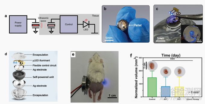 圖4.超聲波的能量轉移。a)超聲波能量傳遞的基本工作原理。由于空氣和組織之間的大阻抗不匹配,傳輸壓電換能器必須與組織直接接觸。在組織內部,植入的系統(tǒng)具有另一個壓電特性,它將能量轉換為電能,為系統(tǒng)提供動力。b)Guan等人對PDT和SDT組合的可植入顆粒的攝影。[88]c)柔性電極和顆粒微led的攝影。[88].d)植入物的爆炸視圖。e)治療下抑制腫瘤復發(fā)的小鼠攝影[88]f)四組腫瘤體積(每組N=4)。經許可復制。[88]版權所有2022,愛思唯爾有限公司。