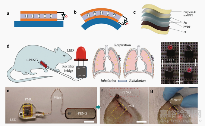 圖5.壓電納米發(fā)電機(PENG)。a,b)PENG的基本工作原理,顯示松弛時發(fā)電機(a)和彎曲時發(fā)電機(b)。壓電層(淡紫色)夾在兩個電極(橙色)之間,其中一個電極附著在柔性基板(藍色)上,當彎曲時,如果電極連接到電路上,就會產生電流。c)由Liu等人開發(fā)的PENG的爆炸結構。[94]d)將生物力學能量從呼吸運動轉換為電的PENG示意圖,為LED提供體內血糖控制的動力。[94]-g)照片(e)連接到電源管理單元的PENG;f)植入鼠標的單元,LED關閉;g)LED的電源,通過磁性開關激活。[94]c-g)經許可復制;[94]版權所有2022,Liu等人。