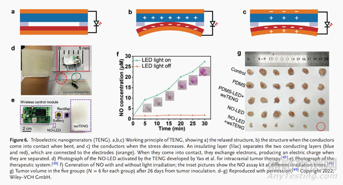 圖6.摩擦電動納米發(fā)電機(TENG)a、b、c)TENG的工作原理,顯示a)松弛結構,b)導體彎曲時接觸時的結構,以及c)應力減小時的結構。絕緣層(淡紫色)將兩個導電層(藍色和紅色)分開,它們連接到電極(橙色)。當它們接觸時,它們會交換電子,當它們被分離時產生電荷。d)Yao等人開發(fā)的用于顱內腫瘤治療的TENG激活的NO-LED的照片。[49],e)治療系統(tǒng)的照片。[49] f)有和不有光照射的NO生成;插圖顯示了不同照射時間的NO檢測試劑盒。[49] g)腫瘤接種26天后,5組的腫瘤體積(每組N=6)。d-g)經許可復制;[49]版權所有2022,Wiley-VCH GmbH。