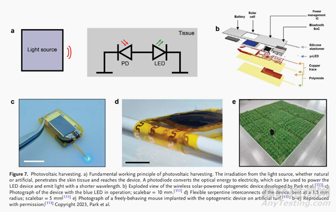 圖7.光伏發(fā)電的收獲。a)光伏采集的基本工作原理。來自光源的照射,無論是天然的還是人工的,都能穿透皮膚組織并到達設備。一種光電二極管將光能轉換為電能,該電能可用于為LED器件供電,并發(fā)出帶有較短波長的光。b)Park等人開發(fā)的無線太陽能光遺傳裝置的爆炸圖[111])藍色LED運行裝置的照片;標度= 10 mm。[111] d)裝置的柔性蛇形互連,彎曲半徑為1.5 mm;標尺=5mm[111])自由行為的小鼠將光遺傳裝置植入人工草坪上的照片。[111]b-e)經許可復制;[111]版權所有2023,Park等人。