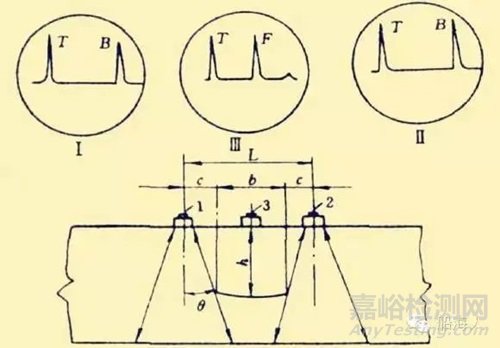 設(shè)1、2位置探頭中心間距離為L(zhǎng),探頭半擴(kuò)散角為θ,缺陷深度h,缺陷長(zhǎng)度b,探頭半徑為r,則: