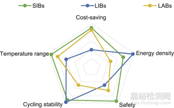 作為L(zhǎng)IB最具成本效益的一種潛在替代技術(shù),室溫SIB表現(xiàn)出諸多優(yōu)勢(shì)。圖6對(duì)比分析了當(dāng)前市場(chǎng)上三種已建立的可充電電池技術(shù):SIB、LIB、鉛酸電池(LAB)。