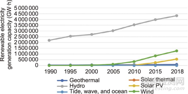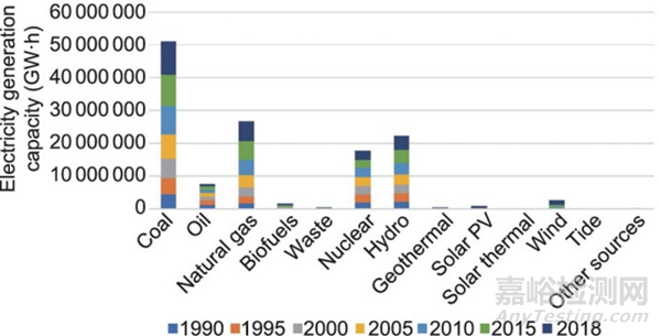 圖1 1990—2018年全球發(fā)電量能源結(jié)構(gòu)示意圖