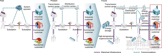 使用可再生能源可以降低成本且有利于低碳經(jīng)濟(jì)發(fā)展,為能源的儲(chǔ)存與轉(zhuǎn)換帶來巨大的發(fā)展機(jī)遇。電力的供應(yīng)迫切需要開發(fā)及利用可再生能源。然而,大多數(shù)可再生能源的主要發(fā)展障礙在于其間歇性。電網(wǎng)運(yùn)營(yíng)需要持續(xù)、穩(wěn)定的電力供應(yīng)。然而,可再生能源會(huì)受季節(jié)、天氣和地點(diǎn)等各種環(huán)境因素限制,這些也通常被認(rèn)為是保持電網(wǎng)穩(wěn)定的不利因素。太陽能發(fā)電只能在有陽光的情況下進(jìn)行,夜間幾乎不發(fā)電。風(fēng)力發(fā)電也面臨類似情況,有時(shí)能產(chǎn)生千兆瓦(GW)電量,有時(shí)只產(chǎn)生幾兆瓦(MW),沒風(fēng)的時(shí)候就無法發(fā)電。隨著可再生能源開始為電站、電網(wǎng)提供越來越多的發(fā)電量,將其順利整合到當(dāng)前的電網(wǎng)運(yùn)營(yíng)中仍面臨挑戰(zhàn)。目前,全球能源系統(tǒng)正面臨著一系列挑戰(zhàn),包括可再生能源滲透率增加、電動(dòng)車市場(chǎng)迅速擴(kuò)張、零碳排放需求持續(xù)增長(zhǎng)、設(shè)備老齡化和能源安全等。智能電網(wǎng)的提出為解決這些挑戰(zhàn)提供了解決策略,同時(shí)將能源行業(yè)帶入一個(gè)更可靠、更實(shí)用、更高效的新紀(jì)元,這將有助于環(huán)境和經(jīng)濟(jì)的健康發(fā)展。圖3顯示了全球電力系統(tǒng)從當(dāng)前電力運(yùn)營(yíng)模式向未來智能電網(wǎng)過渡的路線圖。簡(jiǎn)而言之,智能電網(wǎng)是一種能夠?qū)崿F(xiàn)電能和信息雙向流動(dòng)的網(wǎng)絡(luò),是使用通信技術(shù)、信息技術(shù)、計(jì)算機(jī)技術(shù)和控制技術(shù)等現(xiàn)代先進(jìn)技術(shù)以實(shí)現(xiàn)完全自動(dòng)化的電力傳輸網(wǎng)絡(luò)。智能電網(wǎng)的好處包括提高輸電的供電效率和可靠性,降低公共事業(yè)和消費(fèi)終端的運(yùn)營(yíng)和管理成本,加強(qiáng)大規(guī)??稍偕茉磁c現(xiàn)代電網(wǎng)結(jié)合,支持大規(guī)模電動(dòng)汽車的部署,提高能源安全性,降低碳排放。