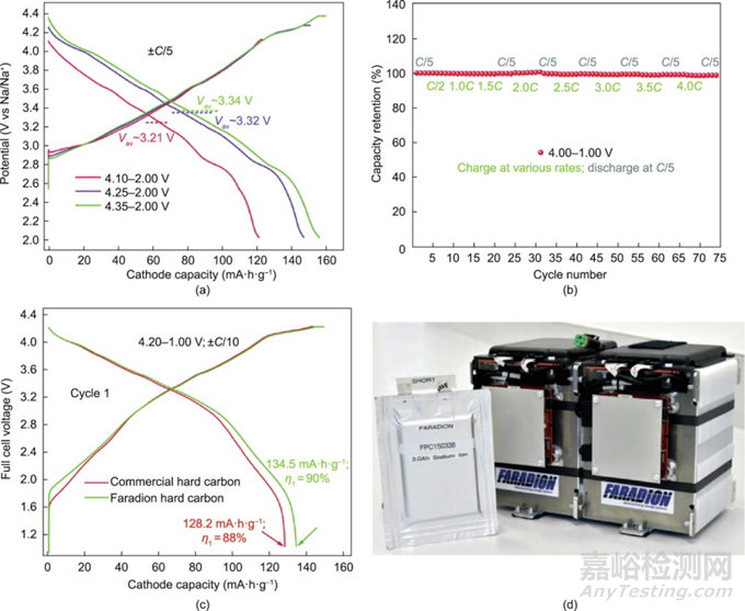 法拉第公司研發(fā)的非水系SIB基于層狀金屬鎳酸鹽正極、硬碳負(fù)極和有機(jī)電解液體系。通過大量的測(cè)試來篩選活性材料組合,使活性材料能夠在比容量、循環(huán)穩(wěn)定性、倍率性能和安全性等方面展現(xiàn)最佳的整體電化學(xué)性能。