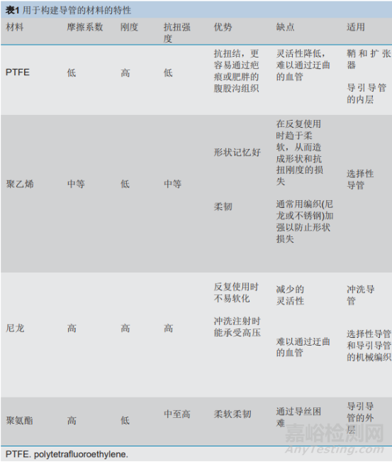 2.外層:血管造影導(dǎo)管可以由聚乙烯、聚氨酯、尼龍、聚四氟乙烯、硅酮、聚氯乙烯或這些材料的組合制成。它們各自的性質(zhì)、優(yōu)點和缺點見表1。管腔的摩擦系數(shù)對于血管造影時導(dǎo)絲容易通過和獲得高造影劑流速很重要。相反,導(dǎo)管外表面的低摩擦系數(shù)有助于其可追蹤性,盡管這是犧牲注射期間位置穩(wěn)定性的。材料的剛性使導(dǎo)管能夠承受血液長時間施加的壓力。