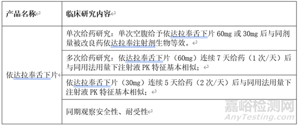 不改變PK特征的改良,大多可通過與被改良藥的BE等效來豁免確證性臨床研究,包括顆粒劑、口崩片、口溶膜等劑型間的轉(zhuǎn)換,也包括某些給藥途徑改變等情形,例如奧氮平口崩片被改良為口溶膜,依達(dá)拉奉注射液改良為舌下片等。依達(dá)拉奉注射液在國內(nèi)上市多年,在將其改良為舌下片后,患者可自主給藥,避免住院,提高順應(yīng)性的同時(shí)降低醫(yī)療資源的占用和頻繁輸液的風(fēng)險(xiǎn),其臨床研究內(nèi)容如表2所示[5]: