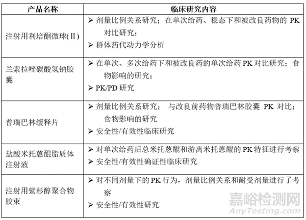 改變PK特征的改良通常需要完成充分的PK研究,劑量比例關(guān)系,與被改良藥的PK對比,給藥方案及劑量探索研究,可能時(shí)的PD研究等,根據(jù)前述研究結(jié)果評估后確定是否開展確證性臨床試驗(yàn)。CDE審評報(bào)告中公布的相關(guān)產(chǎn)品臨床研究內(nèi)容如表3所示: