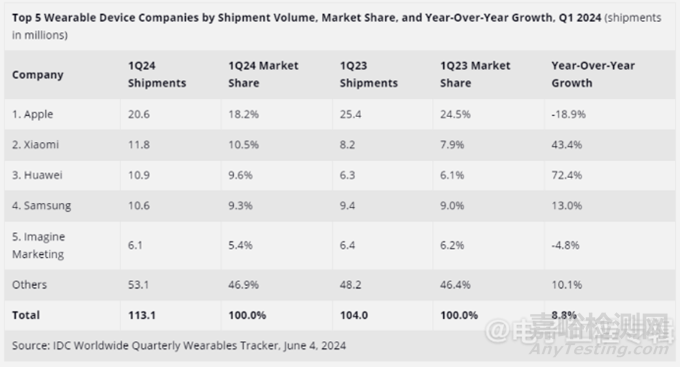 三星電子在可穿戴設備市場的表現(xiàn)呈現(xiàn)出一定的波動和挑戰(zhàn)。根據(jù)2024年第一季度的數(shù)據(jù),全球可穿戴設備出貨量同比增長8.8%,達到1.131億臺。然而,盡管市場整體增長,三星的市場份額卻有所下降,排名第四。