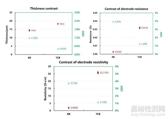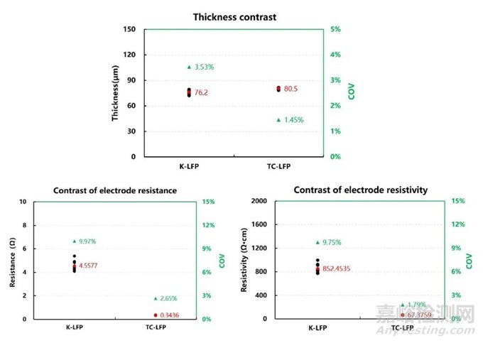 圖5.兩種極片的厚度、電阻和電阻率測試結(jié)果對比