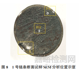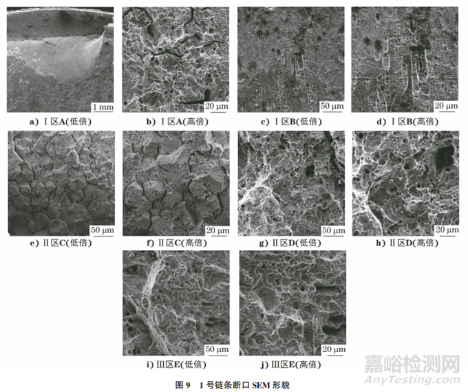在1號(hào)鏈條的斷面上取樣,將試樣置于SEM下觀察,分析位置如圖8所示,分析結(jié)果如圖9所示。由圖9可知:1號(hào)鏈條邊緣可見(jiàn)約1.5mm環(huán)形帶,為細(xì)瓷狀斷口,呈沿晶斷裂特征形貌;心部裂紋呈放射狀花樣,由裂紋源向?qū)?cè)近似平行擴(kuò)展,基體呈準(zhǔn)解理特征形貌。