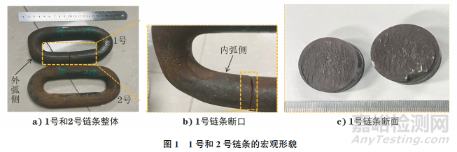 1號(hào)和2號(hào)鏈條的宏觀形貌如圖1所示。由圖1可知:斷裂鏈條斷口位于一側(cè)直邊中間部位,斷面基本與鏈條軸向垂直,未見(jiàn)明顯塑性變形,呈脆性斷裂特征,內(nèi)弧側(cè)局部存在磕碰破損;未斷裂鏈條表面存在明顯氧化腐蝕產(chǎn)物,未見(jiàn)明顯異常。