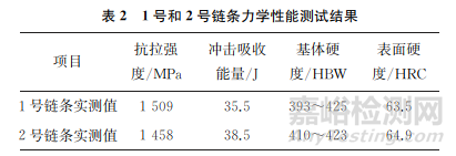 分別利用萬(wàn)能試驗(yàn)機(jī)、布氏硬度計(jì)、維氏硬度計(jì)、擺錘式?jīng)_擊試驗(yàn)機(jī)對(duì)1號(hào)和2號(hào)鏈條的室溫拉伸性能、硬度、沖擊性能及淬硬層(滲碳淬火硬化層)深度進(jìn)行測(cè)試。1號(hào)和2號(hào)鏈條的力學(xué)性能測(cè)試結(jié)果如表2所示,受鏈條尺寸限制,板狀拉伸試樣平行長(zhǎng)度不足以?shī)A持引伸計(jì),因此不對(duì)試樣的屈服強(qiáng)度、斷后伸長(zhǎng)率進(jìn)行評(píng)定。由表2可知:1號(hào)和2號(hào)鏈條室溫沖擊吸收能量分別為35.5J和38.5J,具有一定的韌性儲(chǔ)備;1號(hào)和2號(hào)鏈條的抗拉強(qiáng)度相近;1號(hào)鏈條基體硬度為393~425HBW,2號(hào)鏈條基體硬度為410~423HBW,兩根鏈條表面硬度分別為63.5HRC和64.9HRC,均符合DL/T2359—2021《刮板撈渣機(jī) 技術(shù)規(guī)范》的要求(58~65HRC)。