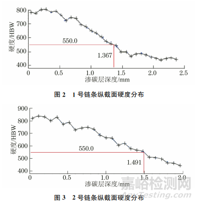 1號(hào)和2號(hào)鏈條縱截面硬度分布如圖2,3所示。由圖2,3可知:1號(hào)鏈條滲碳層深度約為1.37mm,2號(hào)鏈條滲碳層深度約為1.49mm,均低于DL/T2359—2021的要求(≥1.9mm),其原因?yàn)殒湕l中Cr、Mo元素含量偏低,導(dǎo)致鏈條的淬透性較差。