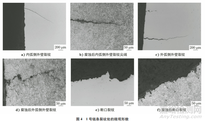 采用光學(xué)顯微鏡對(duì)1號(hào)鏈條的裂紋處進(jìn)行觀察,結(jié)果如圖4所示。由圖4可知:1號(hào)鏈條外弧側(cè)外壁存在向內(nèi)沿晶擴(kuò)展裂紋,裂紋源側(cè)存在向內(nèi)擴(kuò)展的穿晶裂紋,裂紋源對(duì)側(cè)存在向內(nèi)擴(kuò)展的穿晶裂紋及沿晶裂紋,斷面存在向內(nèi)擴(kuò)展穿晶微裂紋。