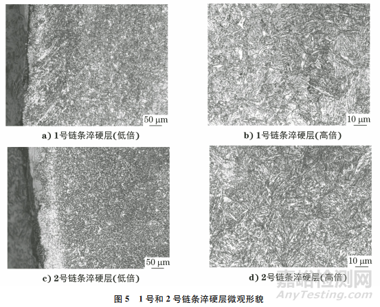 采用光學(xué)顯微鏡對(duì)1號(hào)和2號(hào)鏈條的淬硬層進(jìn)行微觀觀察,結(jié)果如圖5所示。由圖5可知:1號(hào)和2號(hào)鏈條的淬硬層均未見(jiàn)明顯異常。