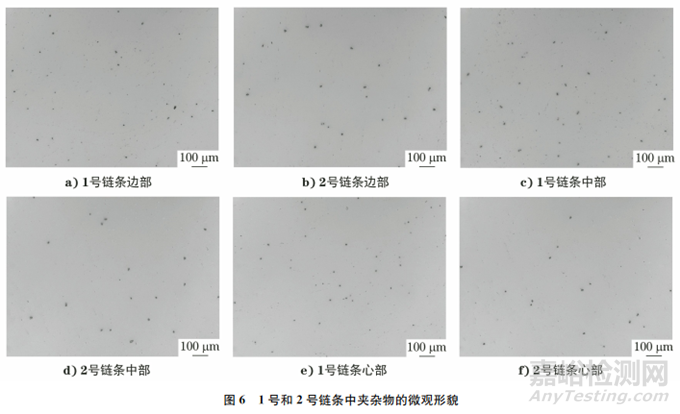 1號(hào)和2號(hào)鏈條中夾雜物的微觀形貌如圖6所示。由圖6可知:1號(hào)鏈條邊部夾雜物為D類粗系2級(jí)、細(xì)系1級(jí),中部夾雜物為D類粗系2.5級(jí)、細(xì)系1級(jí),心部夾雜物為D類粗系2級(jí)、細(xì)系1級(jí);2號(hào)鏈條邊部夾雜物為 D類粗系1.5級(jí)、細(xì)系1級(jí),中部夾雜物為D類粗系1.5級(jí)、細(xì)系1級(jí),心部夾雜物為D類粗系1.5級(jí)、細(xì)系1級(jí)。