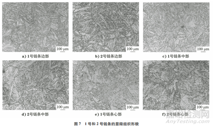 1號(hào)和2號(hào)鏈條的顯微組織形貌如圖7所示。由圖7可知:1號(hào)鏈條邊部、中部、心部組織均為淬火馬氏體;2號(hào)鏈條邊部、中部、心部組織均為淬火馬氏體,1號(hào)和2號(hào)鏈條的組織應(yīng)為回火馬氏體,均存在異常,表明未對(duì)1號(hào)和2號(hào)鏈條進(jìn)行有效回火處理。