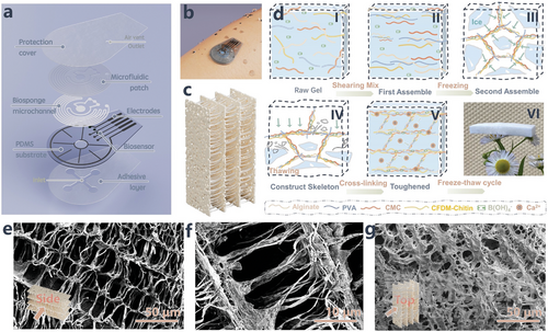 研究設計了一種超親水的分層生物海綿,如圖1c所示,其特征是對水具有異常強大的親和力。這種創(chuàng)新設計旨在克服與收集和保留汗液相關的挑戰(zhàn),包括耗時的過程、污染風險、高流速、苛刻的體積要求和液壓損失不足等問題。同時摻入了從真菌細胞壁中提取的改良羧甲基纖維樣脫乙?;z體幾丁質(CFDM-Chitin),以增強原始生物海綿的性能,并作為結構增強復合材料來強化骨架網絡。