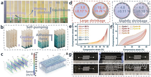 其次,研究者進行了反重力泵送和自發(fā)積液設計。他們合成了一種受木質部結構啟發(fā)的仿生生物海綿。這種生物海綿擁有更堅固的骨架和分層結構,當超親水表面的下部與液面接觸時,毛細管壓力和液體粘附的結合促使液體滲入超親水結構,擴散到整個結構中。這會產生向上的液體攀升,產生“反重力”自泵現(xiàn)象。這個過程允許液體在重力作用下上升相當長的距離(圖2a VIII)。在這種開放結構中,液體沿的毛細血管的上升分不同階段展開:快速填充(圖2a I-IV),潤濕攀升(圖2a IV-VI)和最終平衡(圖2a VI-VIII)。在初始階段,液體的表面張力導致向上毛細管力,壓倒了其他促成因素,從而主導了上升。當液體達到一定高度時,重力的影響逐漸變得更加明顯,導致液體泵送過程減速。在這一點上,沿垂直壁的粘附力起著關鍵作用,由于超親水界面固有的潤濕性,促進液體泵送的最后階段,最終達到偽平衡階段。