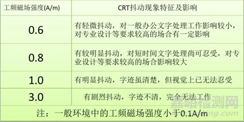 工頻磁場(chǎng)強(qiáng)度與CRT受干擾程度: