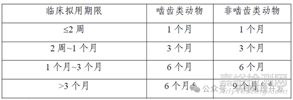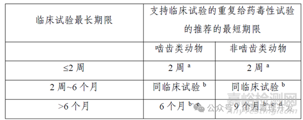 對(duì)于支持藥物上市的重復(fù)給藥研究周期,則參考下表要求。