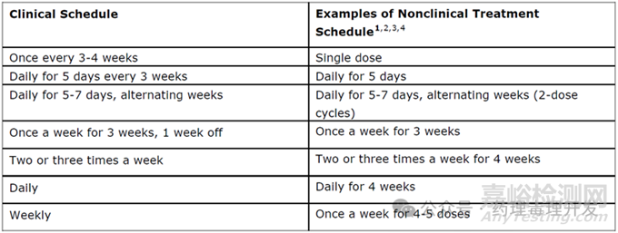 抗腫瘤藥物非臨床評(píng)價(jià)參考ICH S9??鼓[瘤藥物通常采用的非臨床試驗(yàn)給藥方案的實(shí)例,可應(yīng)用于小分子藥物或生物藥物。下表展示了支持早期臨床試驗(yàn)的非臨床給藥方案設(shè)計(jì)。按照這個(gè)表格,如果臨床每3-4周給藥1次,非臨床開展單次給藥毒理試驗(yàn)即可支持IND,但也不絕對(duì)。以ADC為例,臨床多是Q3W給藥頻率,ICH S9問答中對(duì)于這類產(chǎn)品,建議至少給藥2次。