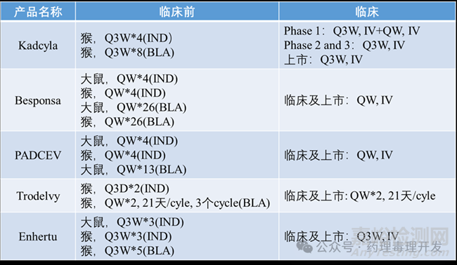 Kadcyla是由ImmunoGen/Roche公司開發(fā)的靶向HER2的ADC產(chǎn)品,通用名Trastuzumab emtansine,出現(xiàn)的比較多的名字是T-DM1。2013年2月22日獲批上市,用于HER2陽性乳腺癌的治療。T-DM1支持首次臨床試驗(yàn)的IND采用的猴Q3W*4。當(dāng)然,按照ICH S9的要求,Q3W*2即可。但考慮到猴重復(fù)給藥毒理試驗(yàn)是2005年開展的,早于ICH S9,不一致也正常,至少是覆蓋ICH要求。支持BLA的動(dòng)物試驗(yàn)周期也是長于3個(gè)月,原因類似,猴Q3W*8重復(fù)給藥毒理試驗(yàn)是2007年開展的,早于ICH S9頒布時(shí)間。不過,這個(gè)產(chǎn)品比較有意思的一點(diǎn)是,臨床一期選擇部分劑量探索了QW給藥周期,這個(gè)給藥頻率并沒有非臨床研究的支持??赡苁腔谇捌谂R床數(shù)據(jù)如PK、非臨床毒理試驗(yàn)暴露量數(shù)據(jù)做的決策。