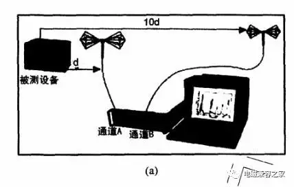 在被測設(shè)備(EUT)的前方一定距離(d)處放置一天線并連接到通道A,負(fù)責(zé)接收來自EUT以及背景共同作用的信號。另外一個(gè)天線則放置在離EUT較遠(yuǎn)的地方,其距離至少是d的十倍,并連接到通道B,負(fù)責(zé)測量來自整個(gè)背景的噪聲情況。