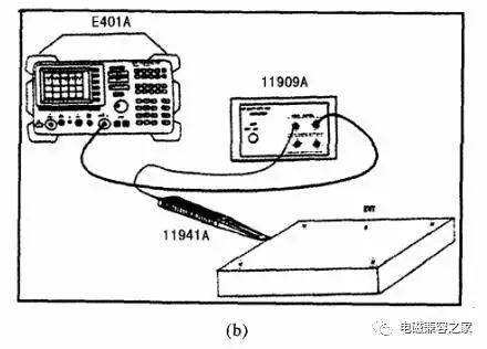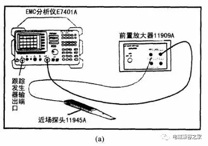 采用安捷倫84105EM電磁兼容診斷系統(tǒng),該系統(tǒng)由EMC分析儀E7401A(含選件跟蹤發(fā)生器前置放大器11909A)和近場探頭套(含11941A和11940A近場探頭)組成,參見圖5(a)。