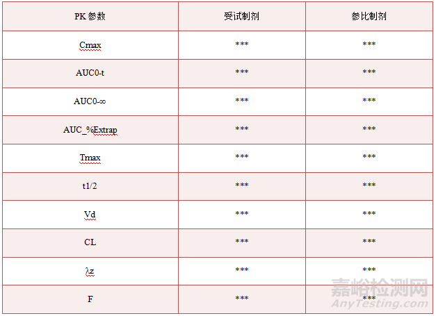 說明PK參數(shù)計算方法和所使用的軟件及版本號。以表格形式列出受試者給予受試制劑和參比制劑后的主要藥代動力學(xué)參數(shù)(包括Cmax、AUC0-t、AUC0-∞、AUC_%Extrap、Tmax、t1/2、Vd、CL、λz、F等),報告其均值、標準差等,并附平均血藥濃度-時間曲線、半對數(shù)曲線??崭购筒秃笤囼灧謩e列出。