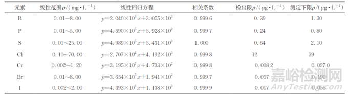 按試驗(yàn)方法測定溴、硼、硫、磷、氯、碘和六價(jià)鉻標(biāo)準(zhǔn)溶液系列,以監(jiān)測元素的質(zhì)量濃度為橫坐標(biāo),對應(yīng)的信號強(qiáng)度為縱坐標(biāo)繪制標(biāo)準(zhǔn)曲線。所得線性范圍、線性回歸方程及相關(guān)系數(shù)見表 1。