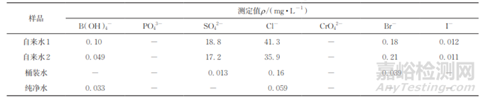 結(jié)果顯示,4份水樣均未檢出磷酸鹽和鉻酸鹽,自來水中硫酸鹽和氯化物含量較高。4種水樣中7種陰離子鹽含量均符合GB 5749—2022要求。
