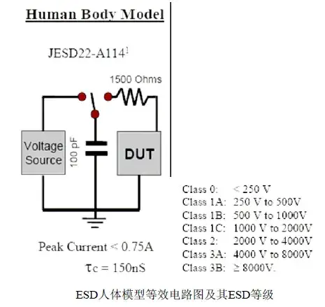 1.HBM:Human Body Model,人體模型:(1500Ω±10% / 100PF±10%) 該模型表征人體帶電接觸器件放電,Rb為等效人體電阻,Cb為等效人體電容。等效電路如下圖。圖中同時給出了器件HBM模型的ESD等級。