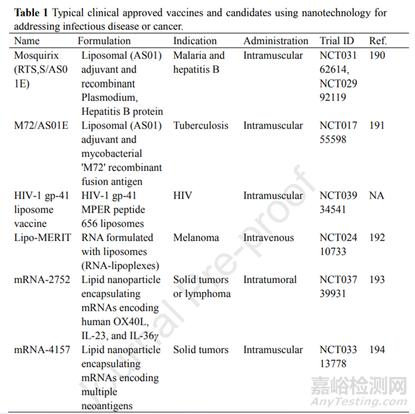 LNPs在許多臨床前和臨床應(yīng)用中顯示出巨大的納米疫苗開發(fā)潛力。除了COVID-19 mRNA疫苗外,還有許多其他LNP–mRNA疫苗正在進(jìn)行臨床試驗(yàn),用于預(yù)防和治療主要的人類健康威脅,包括病毒感染、癌癥和遺傳疾病。