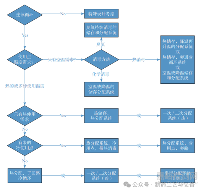 該判斷圖涵蓋了純水和注射用水的各種分配形式。按照法規(guī)要求,注射用水一般為熱儲存,循環(huán)分配系統(tǒng)。結(jié)合生物制藥注射用水多種溫度需求,常溫用水量大,用點(diǎn)多的特點(diǎn)。其常溫注射用水分配系統(tǒng)一般選用儲罐旁通冷循環(huán)(Cooled BypassCirculation),子回路冷循環(huán)(Cooled Sub-loop)和二次分配冷循環(huán)系統(tǒng)(Secondary Distribution)。對于一些比較分散的用點(diǎn),同時(shí)結(jié)合旁路(Slip stream)或帶熱消毒的冷點(diǎn)進(jìn)行分配系統(tǒng)的設(shè)計(jì)。
