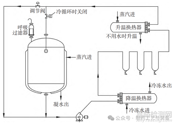 對于這種冷循環(huán),當(dāng)有冷水使用需求時(shí),換熱器進(jìn)冷凍水給注射用水降溫,關(guān)閉冷循環(huán)回罐的閥門。當(dāng)用水結(jié)束,關(guān)閉冷凍水進(jìn)水,升溫?fù)Q熱器給注射用水進(jìn)行升溫,待冷循環(huán)回水達(dá)到 70℃以上,自動打開冷循環(huán)回罐的閥門。由于用水時(shí),沒有熱水回到儲罐,為了維持熱儲存的溫度,一般需要設(shè)計(jì)儲罐的夾套加熱功能。