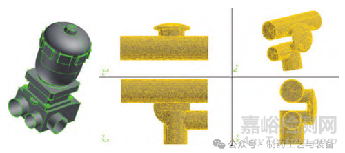 圖7 改進(jìn)的冷循環(huán)進(jìn)水閥三維模型與內(nèi)部流體網(wǎng)格劃分示意圖