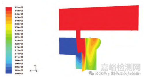 從下面的溫度分布圖可以看出:冷水 25℃(298 K)的回水,對主管道 78℃(351K)的熱水基本沒有影響。說明冷循環(huán)回水對熱循環(huán)的溫度降微乎其微,如圖 8 所示。