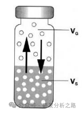 為考察這個問題,我們首先需要要了解一下頂空分析的方法原理。如圖所示,當頂空 體系達到平衡狀態(tài)之后,目標物質分布于頂空瓶中的氣體和液體兩相之中,VG 為氣相體積, VS 為液相體積。