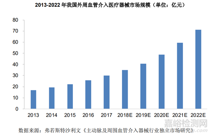 我國(guó)外周血管介入醫(yī)療器械市場(chǎng)規(guī)模由2013年的17.0億元增長(zhǎng)至2017年的30.1億人民幣,復(fù)合增長(zhǎng)率達(dá)15.4%,至2022年我國(guó)外周血管介入醫(yī)療器械市場(chǎng)規(guī)模增至71.2 億元。目前,我國(guó)該領(lǐng)域市場(chǎng)主要被國(guó)外企業(yè)占據(jù), 隨著我國(guó)生企業(yè)研發(fā)能力的不斷增強(qiáng),預(yù)期國(guó)產(chǎn)醫(yī)療器械的市場(chǎng)份額將持續(xù)提升。