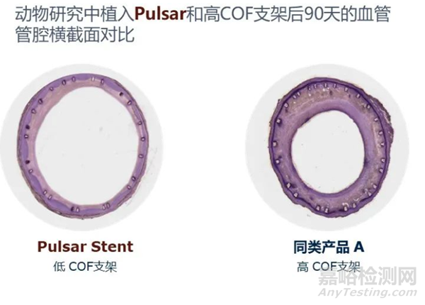 2. 低COF,有效減少血管內(nèi)膜增生持續(xù)外擴(kuò)力(Chronic Outward Force,簡(jiǎn)稱COF)是自膨式支架特有的性質(zhì),即支架在植入后會(huì)對(duì)血管壁產(chǎn)生持續(xù)的向外擴(kuò)張力,已有多個(gè)動(dòng)物研究證實(shí)COF與血管的內(nèi)膜增生有直接關(guān)系。Pulsar-18基于其薄壁支架設(shè)計(jì),具有同類產(chǎn)品中最小的COF,能夠有效減少支架植入后血管的內(nèi)膜增生,保持管腔長(zhǎng)期通暢。