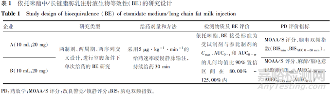 依托咪酯中/長鏈脂肪乳注射液屬于特殊注射劑,從本品目前已開展的BE研究結(jié)果來看,未見其高變異特征,建議采用兩制劑、兩周期、兩序列交叉設(shè)計,進行空腹條件下單次給藥的BE研究。