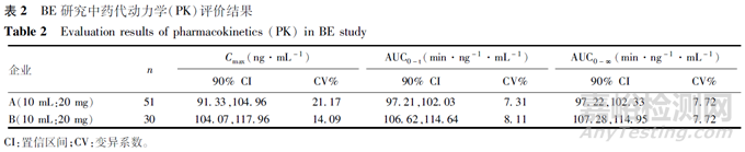 查閱藥物臨床試驗登記與信息公示平臺及藥審中心近年來申報本品仿制藥的BE研究開展情況,整體來講,均采用兩制劑、兩周期、兩序列交叉設(shè)計,進行空腹條件下單次給藥的BE研究。研究中納入健康男性和女性受試者,給藥劑量為5 μg·kg-1·min-1的給藥速率緩慢靜脈輸注,持續(xù)給藥30 min。研究方案規(guī)定檢測物質(zhì)為原形藥物依托咪酯,以依托咪酯的主要PK參數(shù)Cmax、AUC0-t、AUC0-∞作為BE評價的指標(biāo),接受標(biāo)準(zhǔn)為依托咪酯的主要PK參數(shù)幾何均值比值的90%置信區(qū)間在80.00%~125.00%內(nèi)。在藥物輸注過程中,所有受試者均接受了嚴(yán)密的安全性監(jiān)測,由麻醉醫(yī)師在現(xiàn)場進行監(jiān)護和必要的干預(yù)。不同的是BE研究中PD指標(biāo)的選擇,如采用BIS及MOAA/S評分等。目前,已獲批兩家申請人開展BE研究的主要設(shè)計、PK參數(shù)及BE結(jié)果情況,見表1、表2及表3。