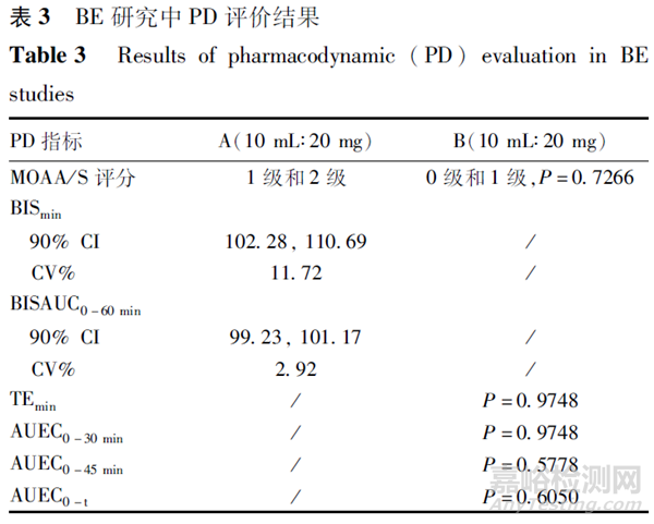 依托咪酯中/長鏈脂肪乳注射液的PD評價主要關(guān)注其麻醉/鎮(zhèn)靜效果。在現(xiàn)有的研究方法中,評分法或儀器法是2種常用的評價手段。為確保評價的準(zhǔn)確性和客觀性,筆者建議研究過程中應(yīng)監(jiān)測腦電雙頻指數(shù)(BIS)和/或進行改良警覺/鎮(zhèn)靜(MOAA/S)評分等。BIS監(jiān)測應(yīng)詳細記錄并分析從給藥到給藥結(jié)束后時間內(nèi)的BIS值-時間曲線下面積(AUCBIS0-t)、給藥過程中BIS達到的最低值(BISmin)、最小BIS值出現(xiàn)時間(t-BISmin)等結(jié)果,反映藥物對大腦電活動的影響程度和持續(xù)時間。MOAA/S評分應(yīng)對評分值、受試者完全蘇醒時間等進行統(tǒng)計分析,以評估受試者在不同鎮(zhèn)靜水平下的表現(xiàn)。PD評價中應(yīng)對受試制劑和參比制劑相關(guān)評分的差異進行統(tǒng)計分析并對結(jié)果進行解釋。
