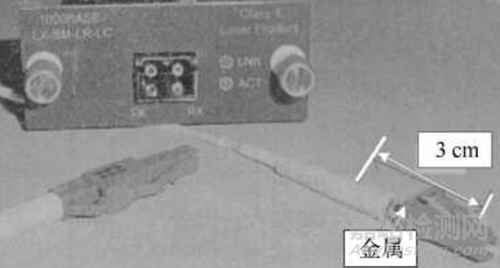 經(jīng)過(guò)仔細(xì)觀察,發(fā)現(xiàn)光纖接口里面有一根金屬加強(qiáng)筋,約3cm左右,處于懸空狀態(tài),而光纖接口的TX發(fā)射端也是金屬的。
