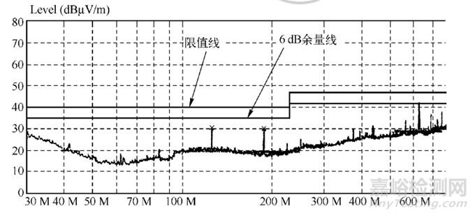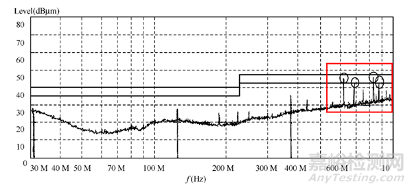 在進(jìn)行輻射測(cè)試時(shí),有幾個(gè)頻點(diǎn)(625 MHz? 687.5 MHz? 812.5 MHz? 875 MHz)超標(biāo),不能滿足CLASS B限值要求,其測(cè)試得到的頻譜圖如下: