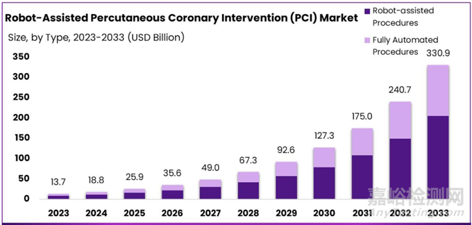 市場規(guī)模:預計到2033年,全球機器人輔助經(jīng)皮冠狀動脈介入(PCI)市場規(guī)模將達到3309億美元,從2023年的137億美元起算,年復合增長率為37.5%。