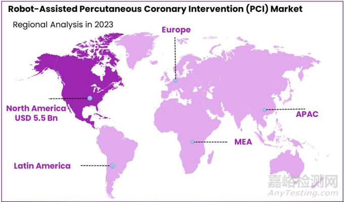 2023年,北美在機器人輔助經(jīng)皮冠狀動脈介入(PCI)市場中占據(jù)主導地位,獲得了超過39.9%的市場份額,當年的市場價值達到了55億美元。這一顯著的市場地位歸因于該地區(qū)的先進醫(yī)療保健基礎(chǔ)設(shè)施、對尖端醫(yī)療技術(shù)的高采納率以及對機器人手術(shù)系統(tǒng)的大額投資。此外,該區(qū)域存在的領(lǐng)先機器人和醫(yī)療設(shè)備公司促進了創(chuàng)新和機器人輔助PCI解決方案的可獲得性。
