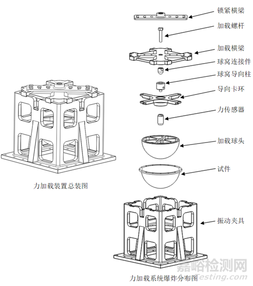 為解決試驗(yàn)過(guò)程中力和振動(dòng)施加方式的解耦難題,采用內(nèi)平衡靜力加載方式設(shè)計(jì)力加載裝置。力加載裝置構(gòu)成如圖2所示,由鎖緊橫梁、加載螺桿、加載橫梁、球窩連接件、球窩導(dǎo)向柱、導(dǎo)向卡環(huán)、力傳感器、加載球頭和振動(dòng)夾具等組成。力加載裝置樣機(jī)如圖3所示。